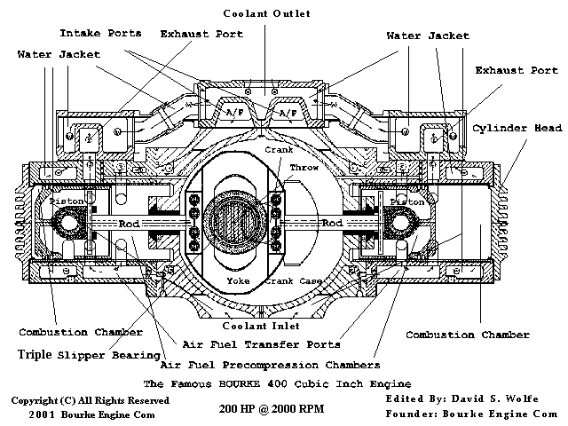 The Bourke Engine is a ported valve, two cylinder, 1 stroke cycle, horizontally opposed piston engine which attempts to harness detonation